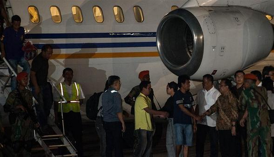 5月1日,在印度尼西亚雅加达的哈利姆·佩达纳库苏马机场,印尼外交部长雷特诺·马尔苏迪(右五)和国务秘书普拉蒂克诺(右二)迎接获释的印尼船员。