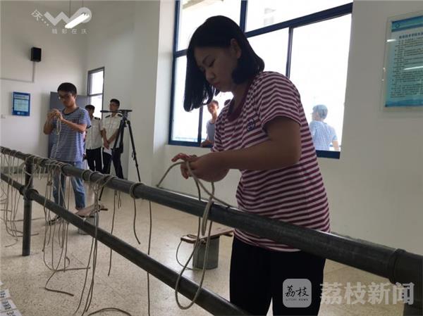 除了撇缆,钢丝绳插接和绳结也是船员的必备技能之一。比如同学们要把六股粗的钢绳破开,然后用螺丝刀等工具将绳头插花编入钢丝绳,这项技能主要用于船上的起重和吊装。而绳结比拼,则需要同学们在短短的一分多钟时间里,打平结、吊桶结、拖木结、瓶口结、扛棒结、双花结、鲁班结等14个不同的水手绳结。