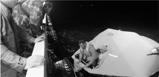 终于,救援人员看到了微弱的闪光。救援船顶着风浪缓慢地向闪光点靠拢,当时救生筏已偏离原位置1海里左右。