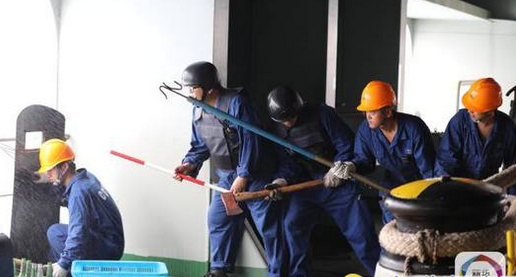 6名海员迅速穿上防弹衣,戴上防弹头盔。其余海员则手持防弹盾牌、太平斧、棍棒和摘钩器等防海盗器械,分3组前往船舶安全相对薄弱环节进行防守。