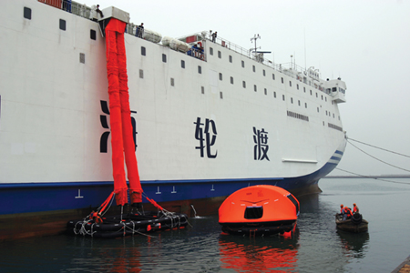 这种救生筏能够快速、大批量安全疏散乘客和船员。VIKING LifeCraftTM系统包含两个主要部分:救生筏本身和收放装置。救生筏为自推式充气筏,配有4台发动机,具有高度的操作性和安全性。4个收放装置可放在救生筏甲板上,也可围放在救生筏周围,每个装置可为200人提供帮助,总共可为800人提供帮助。此系统能满足这些需求的大型灵活疏散系统。