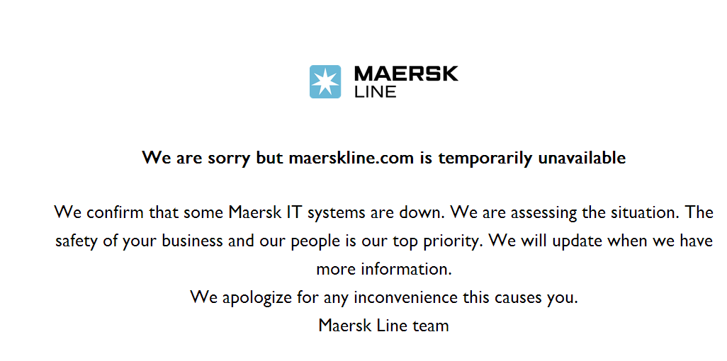 6月28日下午,马士基集团官网发布最新情况说明,马士基在说明中表示:“我们可以确认,2017年6月27日,名为Petya的网络病毒袭击全球,A.P.穆勒-马士基在全球多处办事机构及部分业务单元的IT系统因此出现故障。