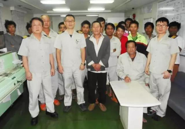 祥福六号渔船船员获救之后与长帝轮船长戴燕堂(前排左二)等合影,前排左三(着灰色外套者)为祥福六号船长。