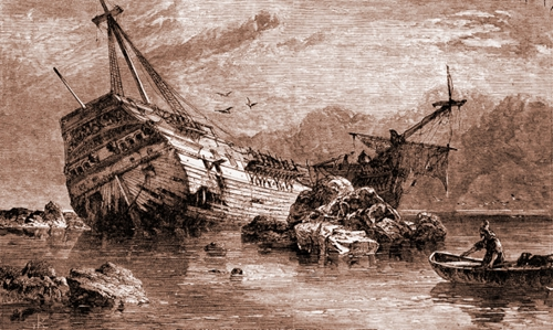 第三天,瞭望的水手发现了一个小岛。这是个孤岛,三面是悬崖峭壁,南面是一片沙堆,外围是密密麻麻的珊瑚礁,木质的救生艇随时可能被涌浪冲向珊瑚礁而撞得粉碎。