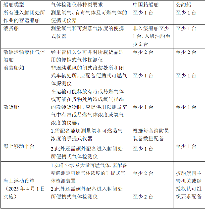 检测仪需根据船舶类型及作业风险进行配置,普通船舶多数情况至少配备一台,散装液化气体船、入级油船及海上移动平台等特殊船型船舶则需视情况配备多台。以下简要梳理便携式气体检测仪配备要求:
