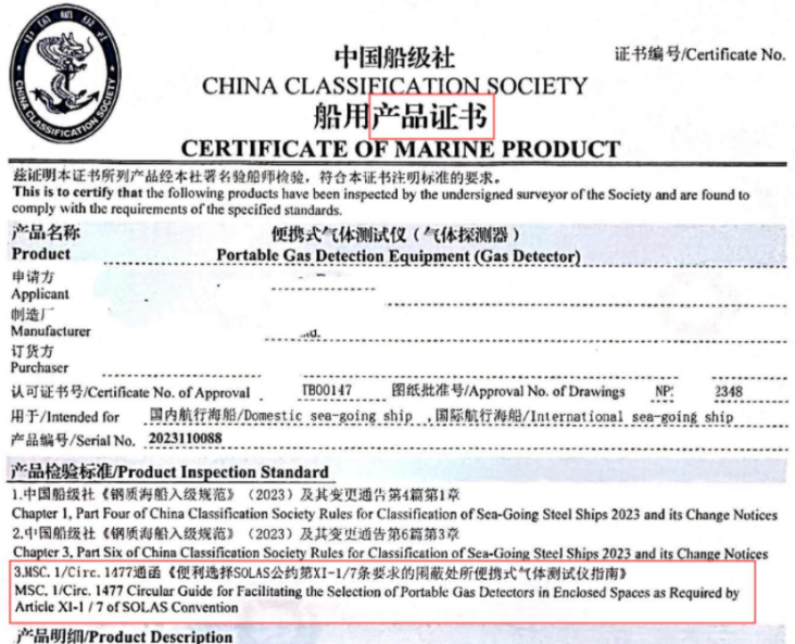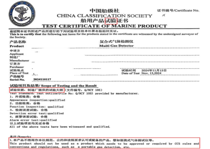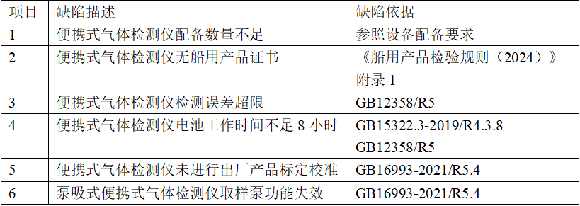 检查发现部分中国籍船舶便携式气体检测仪仅持有船用产品试验证书,该类证书为船舶检验机构依据厂家提供的试验大纲签发,仅证明其产品符合“厂家标准”,未按船用产品证书签发流程对检测仪进行检验。因此,此类证书不等同于船舶检验机构签发的船用产品证书。