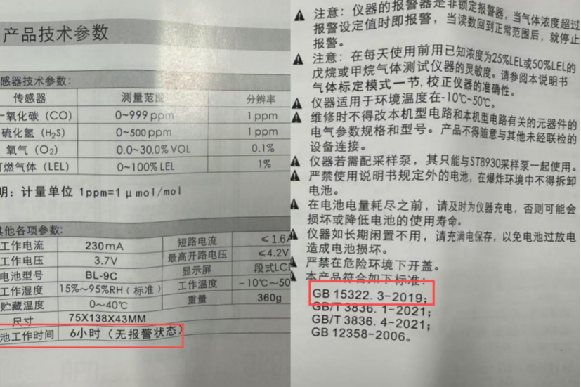 检查发现某船便携式气体检测仪电池续航时间仅6小时,而产品说明书却标注产品符合GB15322.3-2019标准(电池续航时间最低8小时),反映出设备厂商出厂试验未严格遵循国标要求,确保设备性能真实达标。便携式气体检测仪电池低电量时会出现性能下降的情况,部分设备在电量低于20%时会自动降低检测频率,导致检测精准度和灵敏度下降。