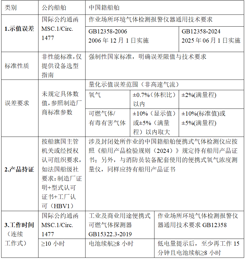 公约船与中国籍船舶在便携式气体检测设备的技术要求上存在一定差异,主要体现在示值误差标准、产品持证要求及电池工作时间等方面。以下简要梳理公约船与中国籍船舶各类要求对比及常见缺陷: