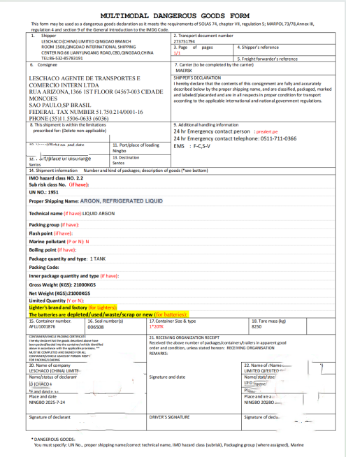 经进一步核查,货主在完成液氩充装后,未按IMDG Code规定计算并标识实际维持时间,也未向货代公司提供该项技术资料,而根据货代公司填报的危险品订舱表格(DGD)显示,并无此项内容填写要求,故承运人也未核实实际维持时间,导致整条供应运输链出现重大安全隐患。