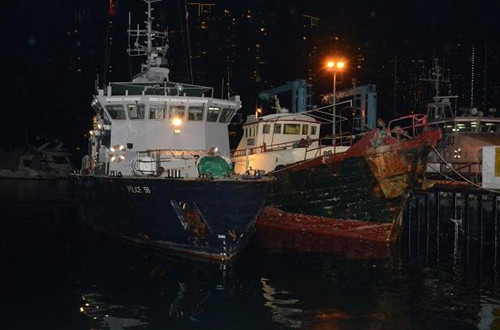 其间两船发生踫撞,两名水警人员受伤流鼻血及感头晕不适,最后渔船被截停检查,水警将渔船上四名非法入境男子逮捕,连人带船拖返香港仔深湾道水警基地调查。