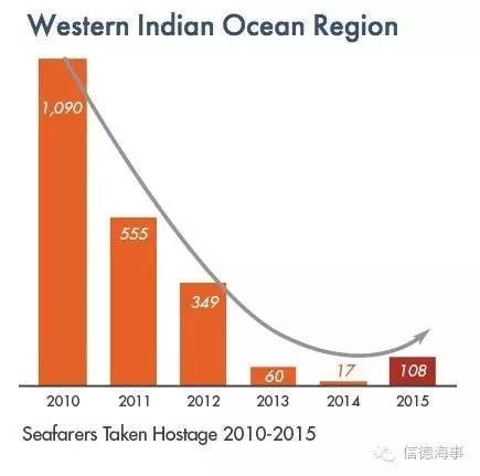 根据OBP数据显示,东非目前也正在按照这个局面发展,2014年被劫持的海员人质为17人,而2015年的这一数据达到了108人。