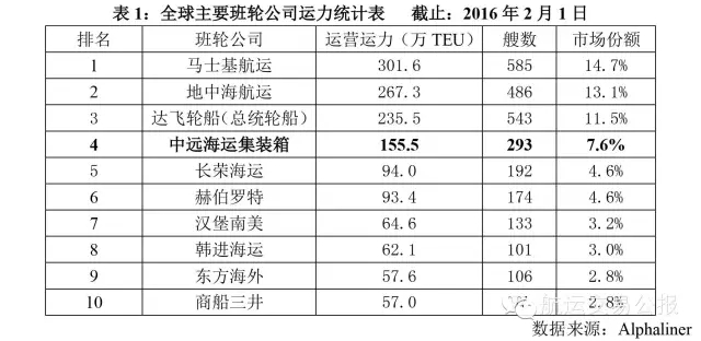 根据Alphaliner统计,截止到2月1日,中远海运集装箱拥有集装箱运力为155.5万TEU,市场份额约7.6为%,排名全球第4(见表1)。7.6%的市场份额约为“状元”马士基航运的一半、“榜眼”地中海航运的六成、合并总统轮船后的“探花”达飞轮船的七成,但比目前排名第四的长荣海运高出约65%规模。