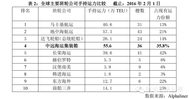 但从手持运力(见表2)来看,中远海运集装箱截至到2月1日拥有订单为55.6万TEU、36艘船,占现有运力份额的35.8%,手持运力规模在全球前10大班轮公司里仅次于地中海航运的57.3万TEU。待到2018年目前手持运力全部交付之后,中远海运集装箱运力规模将超过200万TEU,与达飞轮船的运力规模进一步接近,进入到全球班轮公司第一梯队。