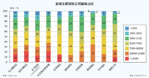 而从中远海运集装箱的船型结构(见下图)来看,截止到2月1日,13300TEU以上型集装箱船占比为21%,10000-13300TEU型船占比为17%,7500-10000TEU型船占比为21%,5100-7500TEU型船占比为9%,3000-5100TEU型船占比为24%,2000-3000TEU型船占比为2%,2000TEU以下型船占比为6%。这样的船型比例,与具备布局全球航线能力的前三大班轮公司相比,已经颇为类似。