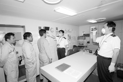 昨天上午,一艘从非洲起航的船舶靠泊码头。这是一艘广州市航商国际船舶代理有限公司代理的东非航线班轮,其途经了寨卡疫情受染地区。检疫人员首先登上船舶,对船舶进行入境卫生检疫,确认没有发现异常情况后,其余人员相继登上船舶。检疫人员随后与船舶管理公司确定的健康管理员说明智能体温监管需要其配合做的工作,包括手机APP的操作技巧、佩戴要求等,而后与健康管理员一起给每位船员佩戴可穿戴体温检测仪。
