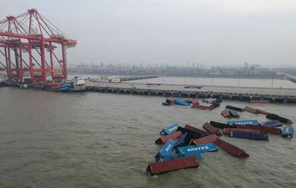 5月1日下午,一艘集装箱船在外高桥五期码头因装载不当发生右倾,致44只集装箱落水。