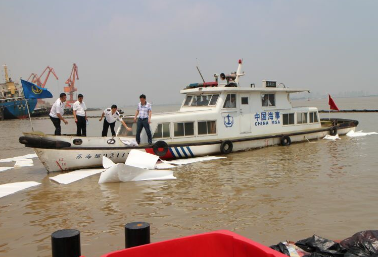近日,一艘废油回收船在江阴市白屈港河口沉没造成柴油泄露,污染水域情况非常严峻。江阴市地方海事部门接到报警后立即启动应急预案,并及时赶赴现场进行处置。