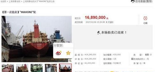 近日,上海海事法院通过淘宝网司法拍卖平台,以人民币1689万元价格成功拍卖巴拿马籍船舶“MAHONI”轮。“MAHONI”轮是上海海事法院2017年网络拍卖的第一艘船舶,也是全国首例通过网络平台成功拍卖的外籍船舶。