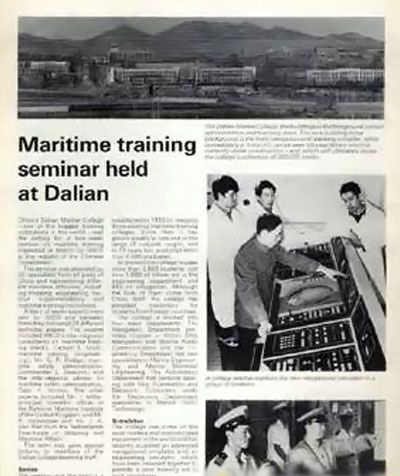 经过研究讨论,海事组对公约草案形成了初步意见:公约生效条件应该实现普遍性原则,默认接受的时间间隔应长些,以便发展中国家有充分时间考虑。可以以1974年安全公约为蓝本。关于附件中的专业技术要求,对培训部分,我国航海院校对水上专业的教学符合公约草案要求,可以接受。“海协”新闻曾刊登一篇专文介绍大连海运学院(现大连海事大学),认为是世界一流海运学府(见图1)。值班标准和安排方面,我国建设远洋船队是以中波合营轮船公司起家的。船上值班标准和安排都与国际习惯一致。至于船员考试和发证,我国港务监督局(今海事局)也是按照国际通例来实施。唯一的问题是公约草案规定船与船、船与岸的通话都要用英语。英语是世界航海通用语言,但那时我国不可能做到。