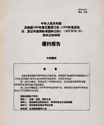 为推动各缔约国正确实施此公约,“海协”还要求缔约国报告履约情况,经考核合格,登入向全球公布的白名单。原计划用黑名单来曝光批评那些缔约又不严格执行公约的国家,经讨论还是以正面鼓励为主。我国是向“海协”第一个申报的国家,履约报告封面见图4,并经考核合格,登上白名单。