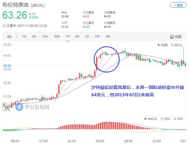 华尔街见闻此前援引分析师观点称,经历反腐风暴后,沙特不可能经得起油价再跌的打击,肯定愿意冒险支持油价走高,而不是让其下跌,国际油价有望涨至70美元/桶。