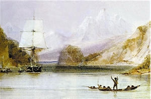 1831年12月27日,贝格尔号从英格兰西南部的普利茅斯港启航(1620年五月花号也是从这里启航,此“普利茅斯”是世界各地同名城市的发源地)。船上载有12位军官,1位水手长,42位水兵和8位少年见习水手,一位医生,一位专门看管天文钟和其他仪器的人,一位绘图员,一位曾去过火地岛的传教士和三位火地岛土著人。只有两个与航行无关的人,一位是22岁的博物学家达尔文,一位是画家奥古斯特·厄尔(后来生病,换上了画家康拉德·马滕斯)。1833年底,贝格尔航跨越大西洋来到蒙得维的亚 (Montevideo今天的乌拉圭首都)附近,随行画家奥古斯特·厄尔因病上岸,不能继续参与航行。正在这里进行创作的英国画家康拉德·马滕斯Conrad Martens,1801~1878年)与菲茨·罗伊船长签约成为随行画家,他也由此与达尔文结下了一生的友谊。