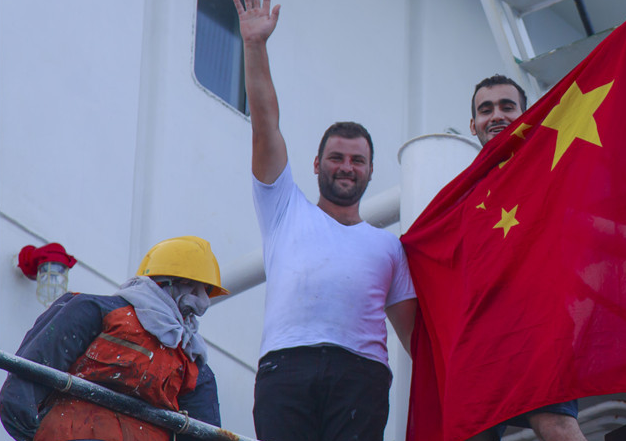 被我海军营救的外籍船员举起五星红旗表示感谢