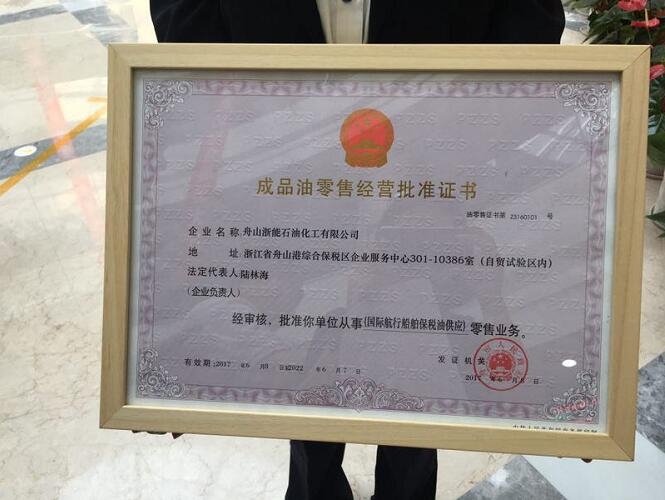 根据自贸试验区统一规划,4家企业获得首批国际航行船舶保税油经营资质,分别为浙江省属大型能源企业浙江省能源集团有限公司下属舟山浙能石油化工有限公司、世界五百强中国华信集团下属华信国际(舟山)石油有限公司、拥有20年保税油供应经验的中油泰富船舶燃料有限公司、舟山本土明星企业和润集团下属舟山港综合保税区能源化工有限公司。