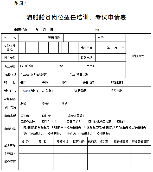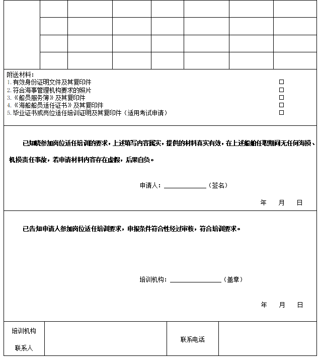第三条 船员参加岗位适任培训时需满足“11规则”和《中华人民共和国船员培训管理规则》有关船员年龄、持证情况、海上服务资历、安全任职记录、身体健康状况等方面的要求,并向培训机构提交《海船船员岗位适任培训、考试申请表》(见附录1)。