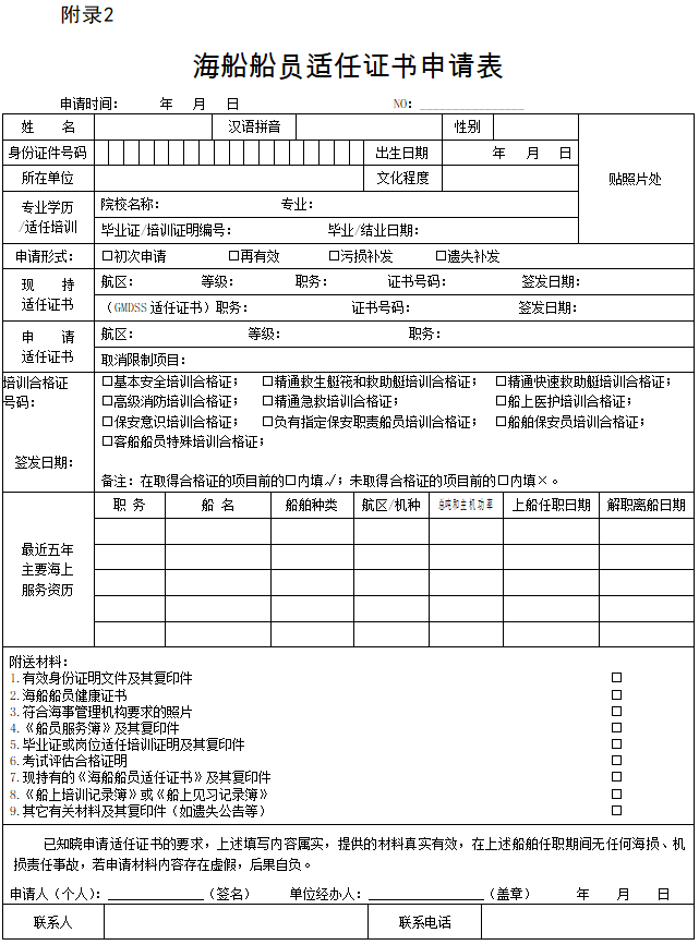 第十二条 船员申请适任证书时,应向海事管理机构提交《海船船员适任证书申请表》(见附录2)。