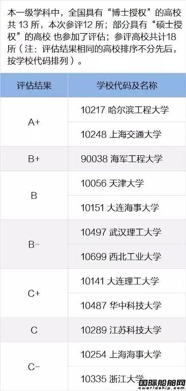 12月28日,教育部学位与研究生教育发展中心正式发布了全国第四轮学科评估结果,来自全国各大高校和科研院所的7450余个参评学科评估结果正式揭晓。在船舶与海洋工程学科评估中,哈尔滨工程大学和上海交通大学获最高A+等级,不出意料双
