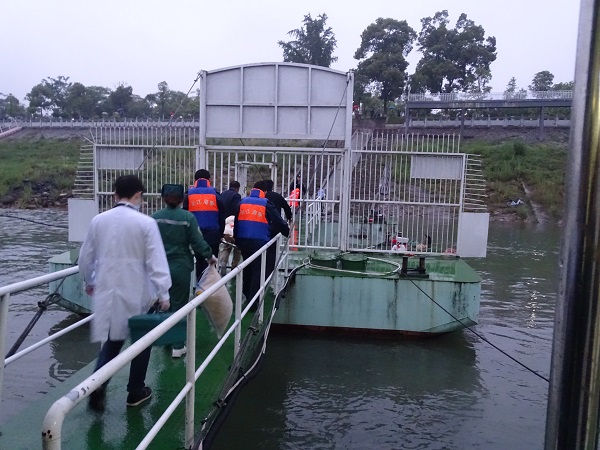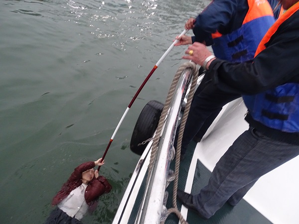按照既定流程,训练有素的人员分工明确。一名执法人员联系报警人员询问详细信息并与120急救中心联系,其余人员冒雨到海巡艇前甲板协助瞭望,寻找落水人员。到达南湖水厂水域后,经过仔细搜寻,执法人员很快找到了落水人员。海巡艇驾驶员陈明耀同志沉着冷静,驾驶着海巡艇缓慢靠近落水者。其余人员借助着套索将落水人员拉至艇边,齐心协力将落水人员救助上艇并采取了现场急救和保暖处理。经过初步探查,发现落水人员生命体征平稳但处于昏迷状态,需立即送往医院抢救。为缩短上岸救援时间,海巡艇一边驶往最近的水文码头,一边电话通知救护车就近接力救援。海巡靠泊水文码头后,随艇人员合力将落水人员转移至水文趸船上,此时救护车也已到位。随后,公安部门等其他相关单位和群众也参与了救援工作,大家齐心协力将落水人员抬上了救护车。
