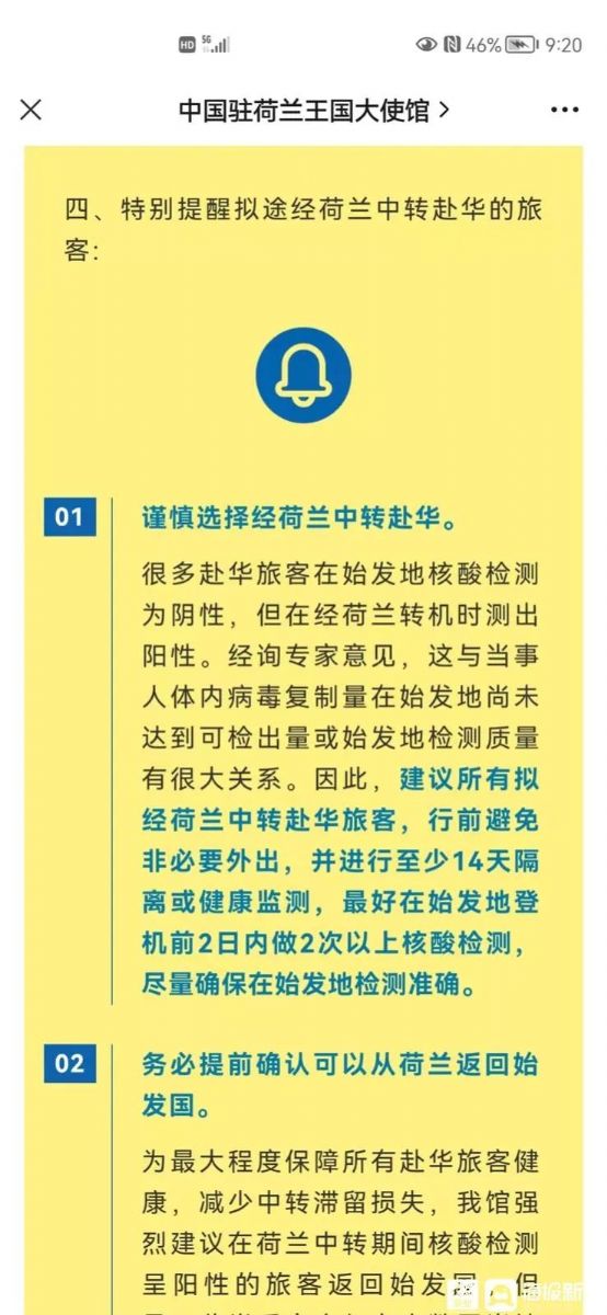 中国驻荷大使馆曾经提醒,很多赴华旅客在始发地核酸检测为阴性,但在经荷兰转机时测出阳性,与当事人体内病毒复制量在始发地尚未达到可检出量或始发地检测质量有很大关系。