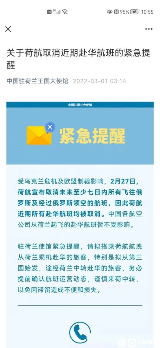 此后的日子,他经历了核酸检测阳性,又经历了复阳。总算看到回国的希望了,王建改签荷兰航空3月3日飞往中国的航班。俄乌发生冲突,受此影响,2月27日起,荷航所有赴华航班均被取消,他的回国之路再次受阻。