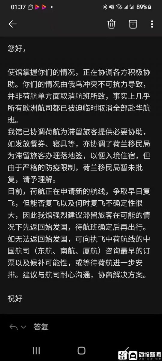 后来荷兰航空调整航线,优先给这批人解决行程,他们3月8日回国了。