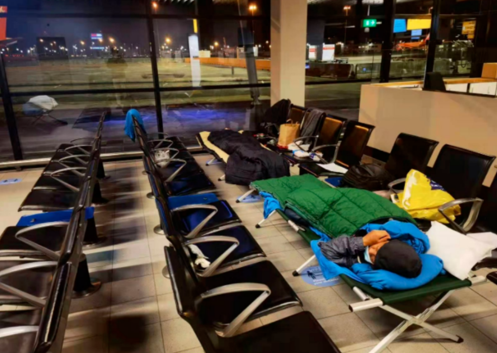 走不了了,只能找地方睡觉。为了防止被传染,我们只能在机场找人少的地方睡觉。这边夜里实在太冷,只有三四度,晚上被冻醒好几次,就这样身心俱疲地熬到了第二天早上。
