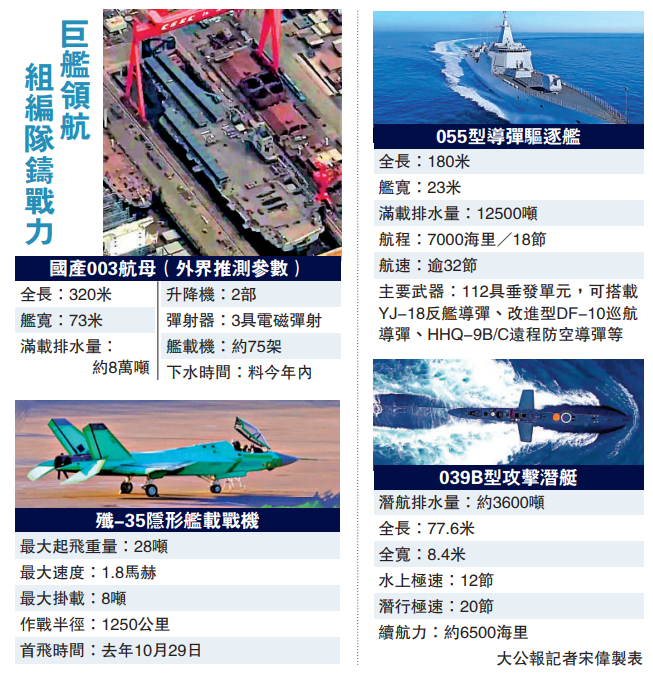 包括003航母的排量、弹射器数量及大约75架舰载机,及主要舰载机就是歼35隐身战机。