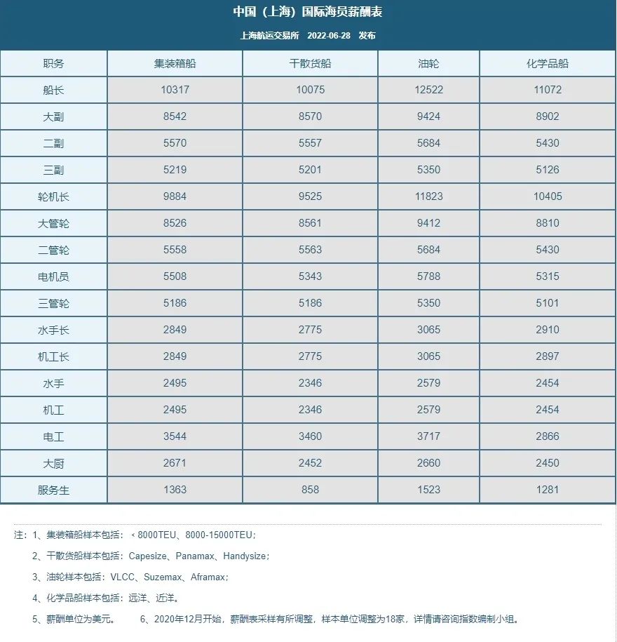 中国(上海)国际海员薪酬指数(2022.06.28)